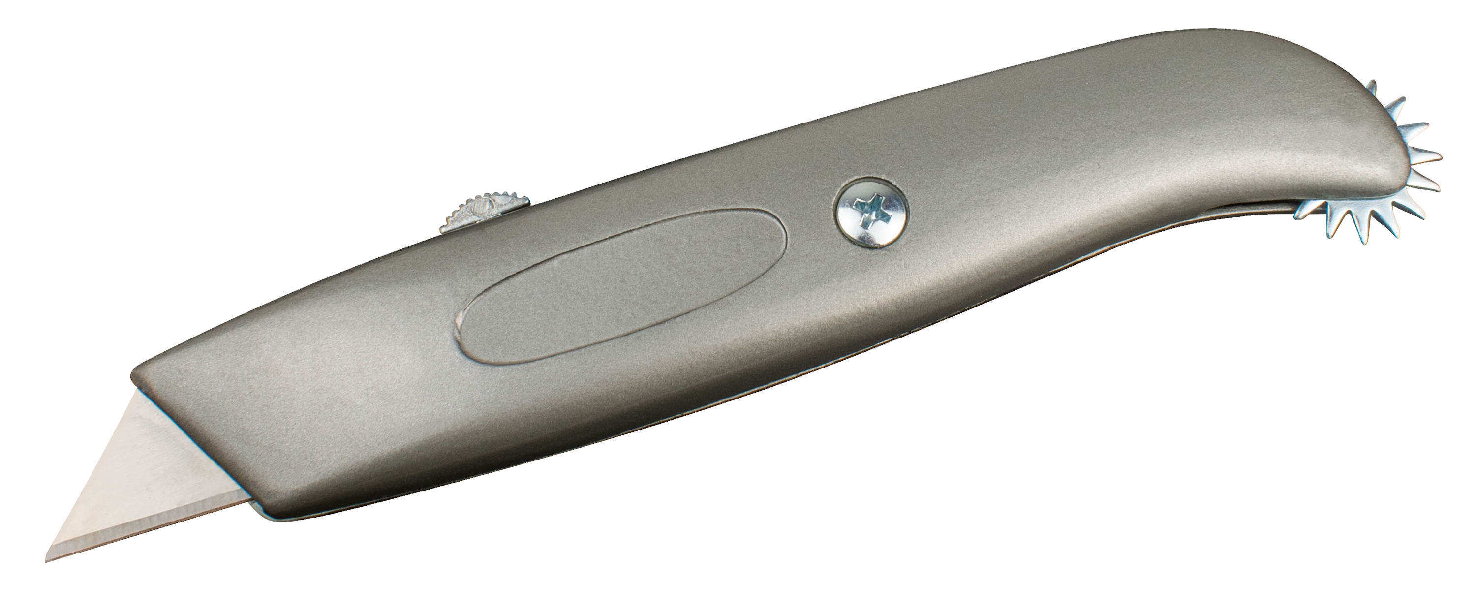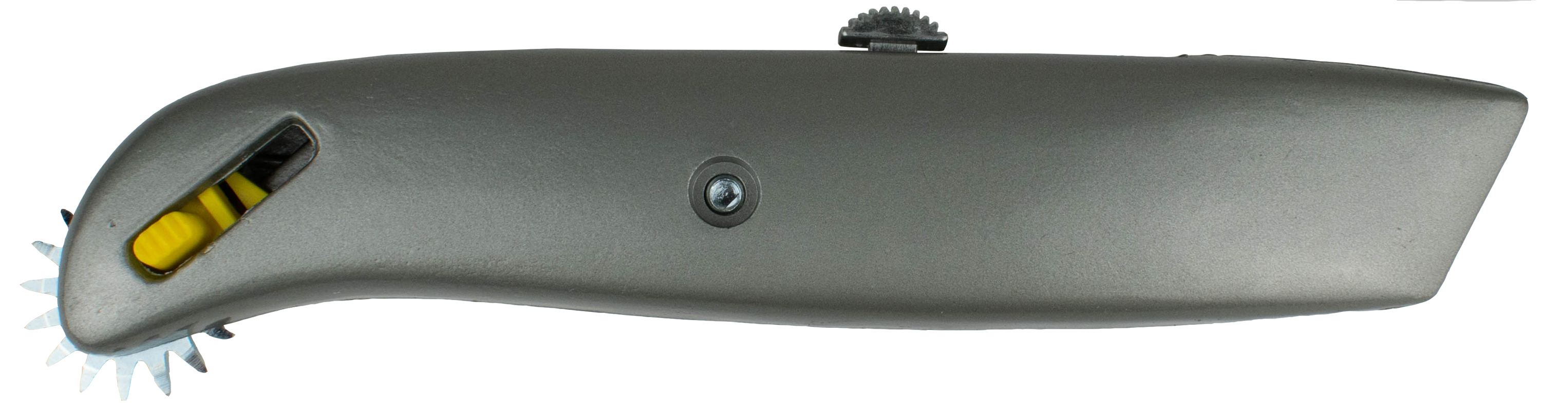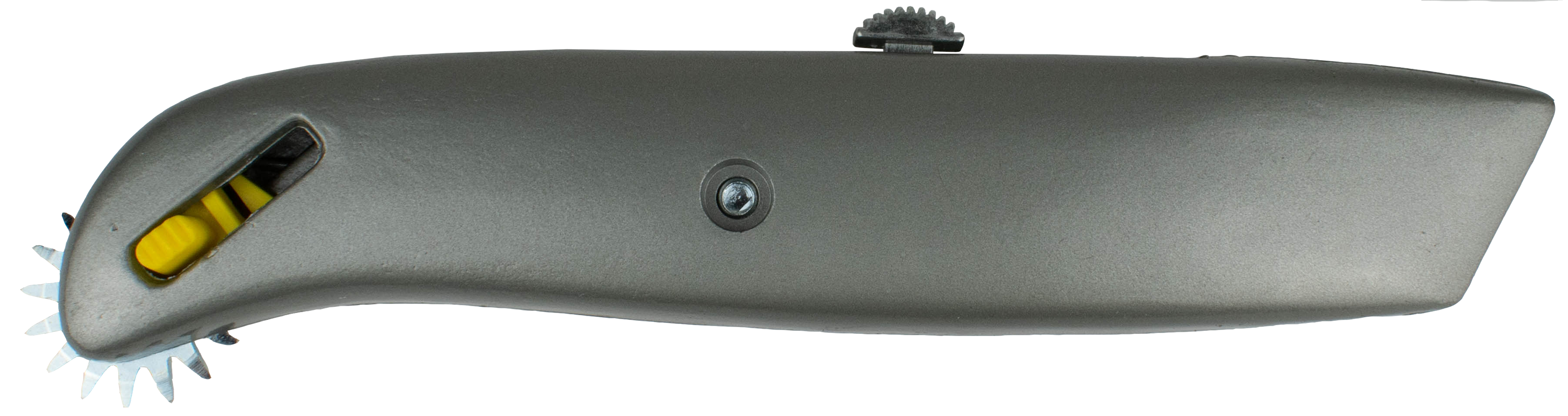 A heavy-duty knife with a metal body and the classic design retractable blade. Beneficial for cutting cardboard boxes, polyethylene bags, and styrofoam and more!