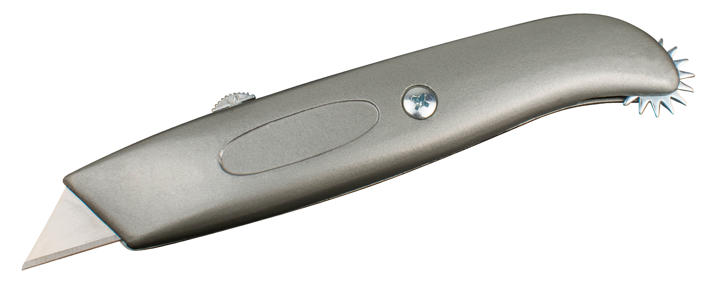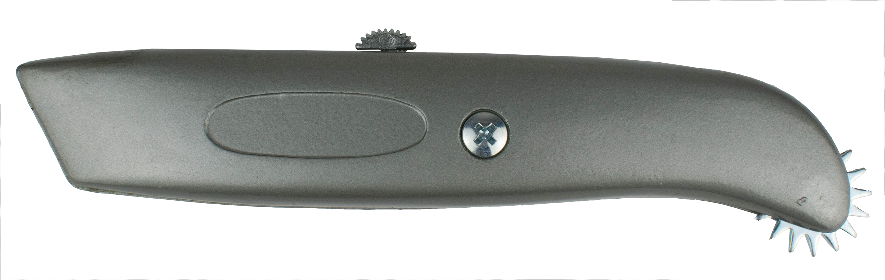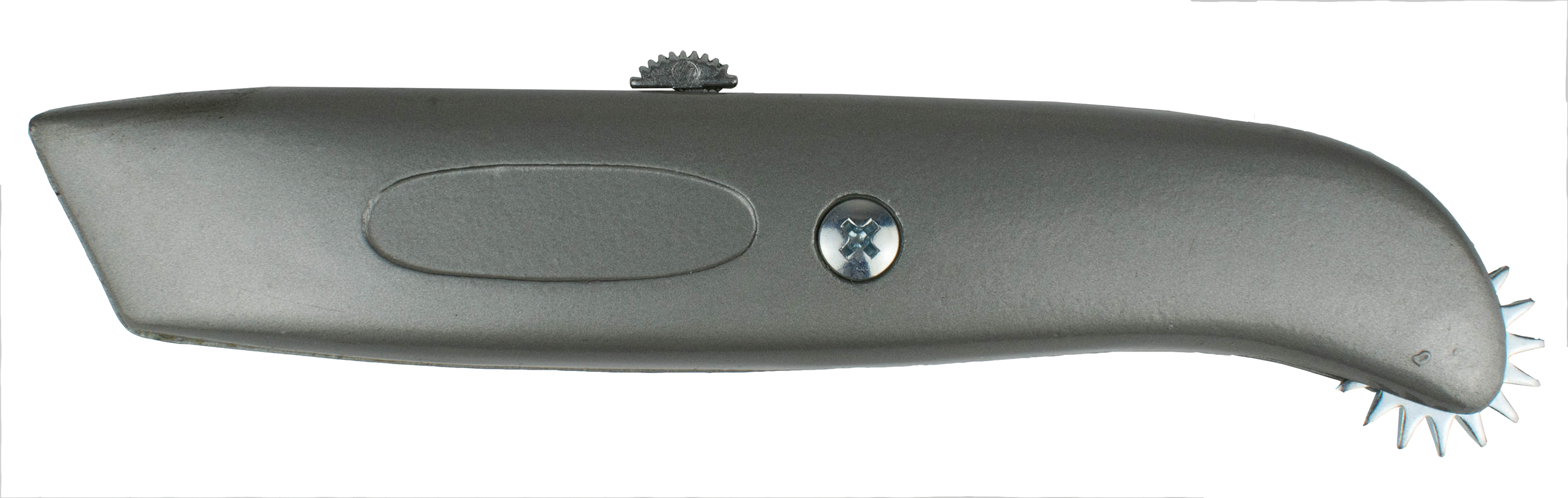 A heavy-duty knife with a metal body and the classic design retractable blade. Beneficial for cutting cardboard boxes, polyethylene bags, and styrofoam and more!