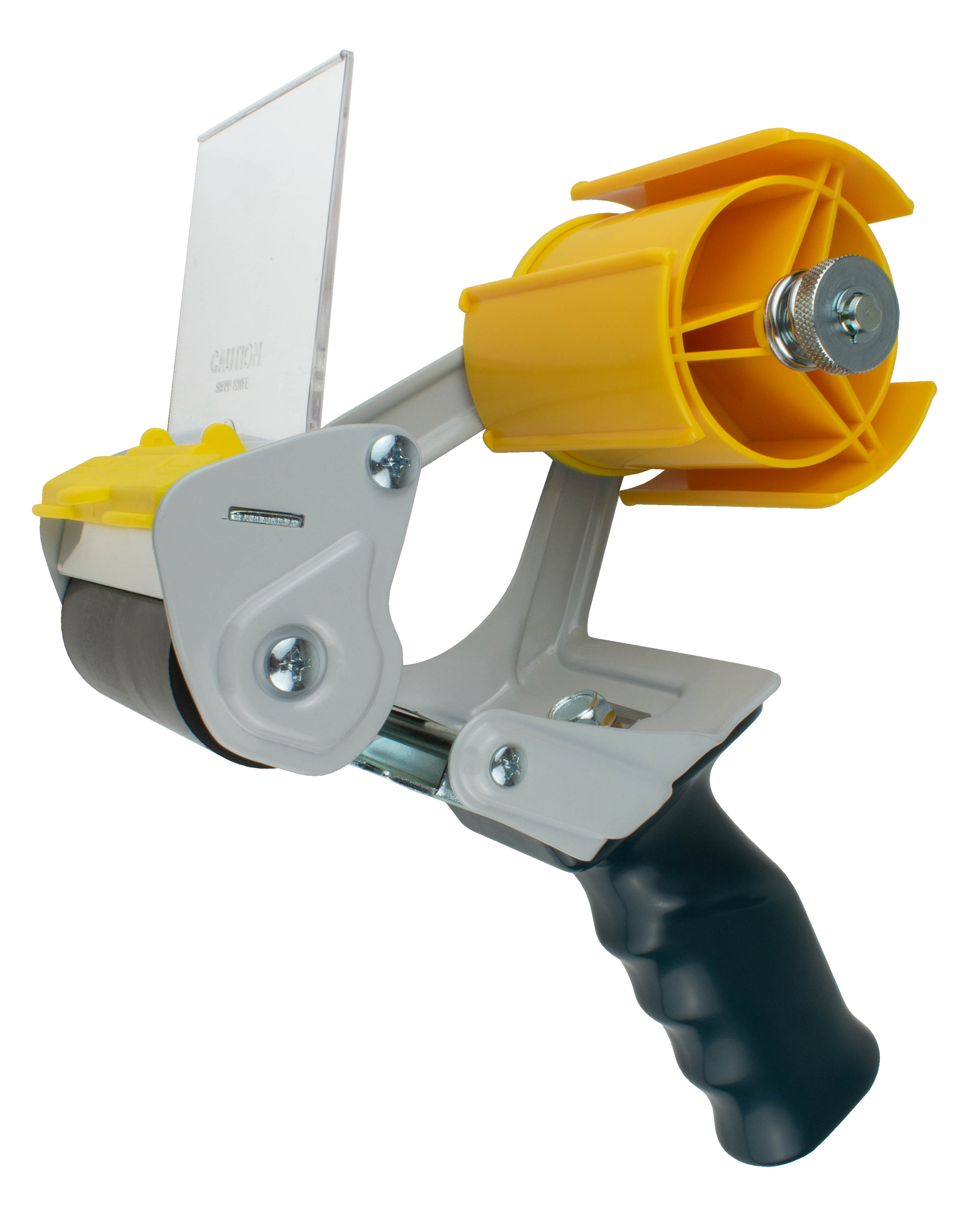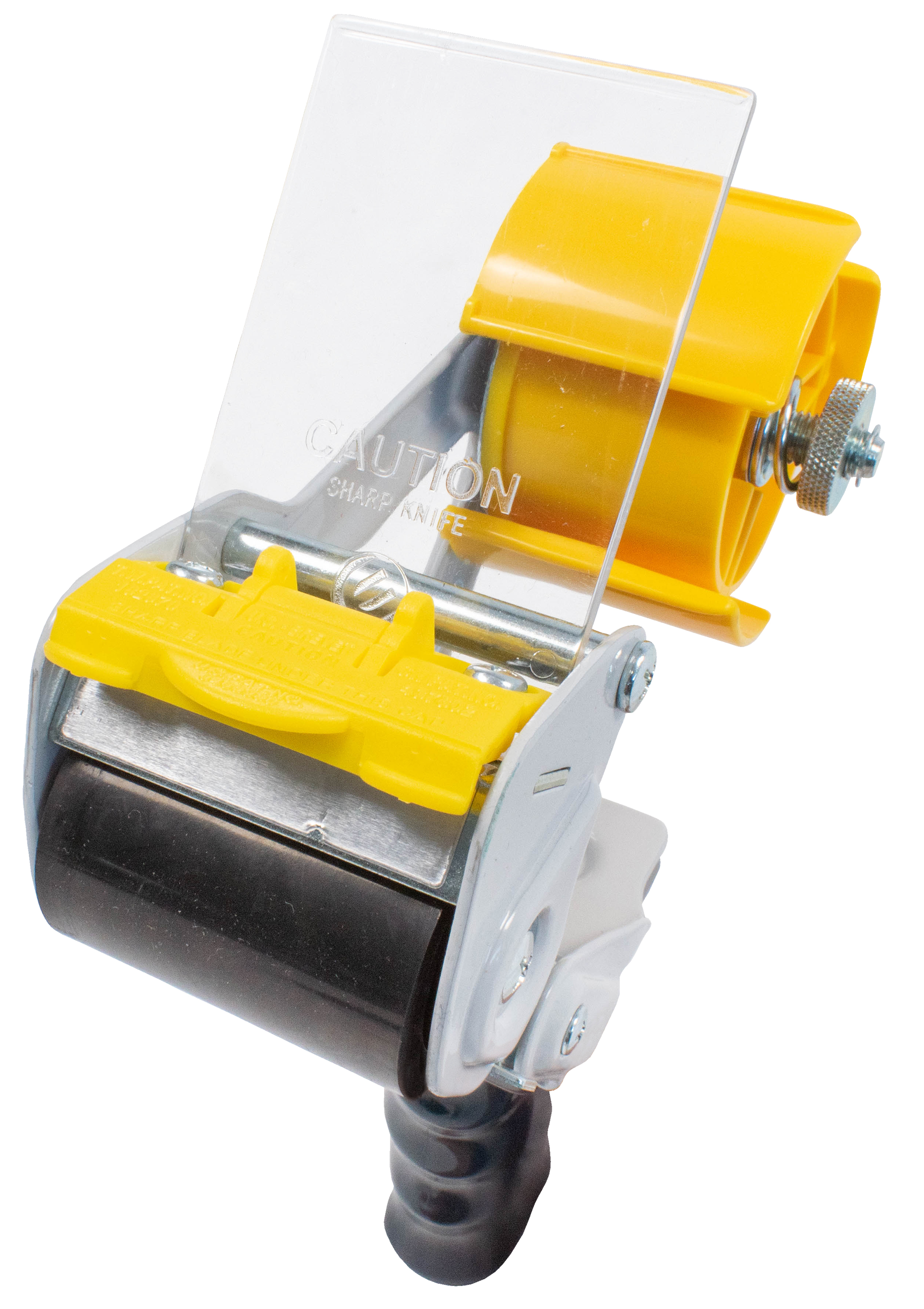This premium tape dispenser has a simple design and solid steel frame with a plastic handle