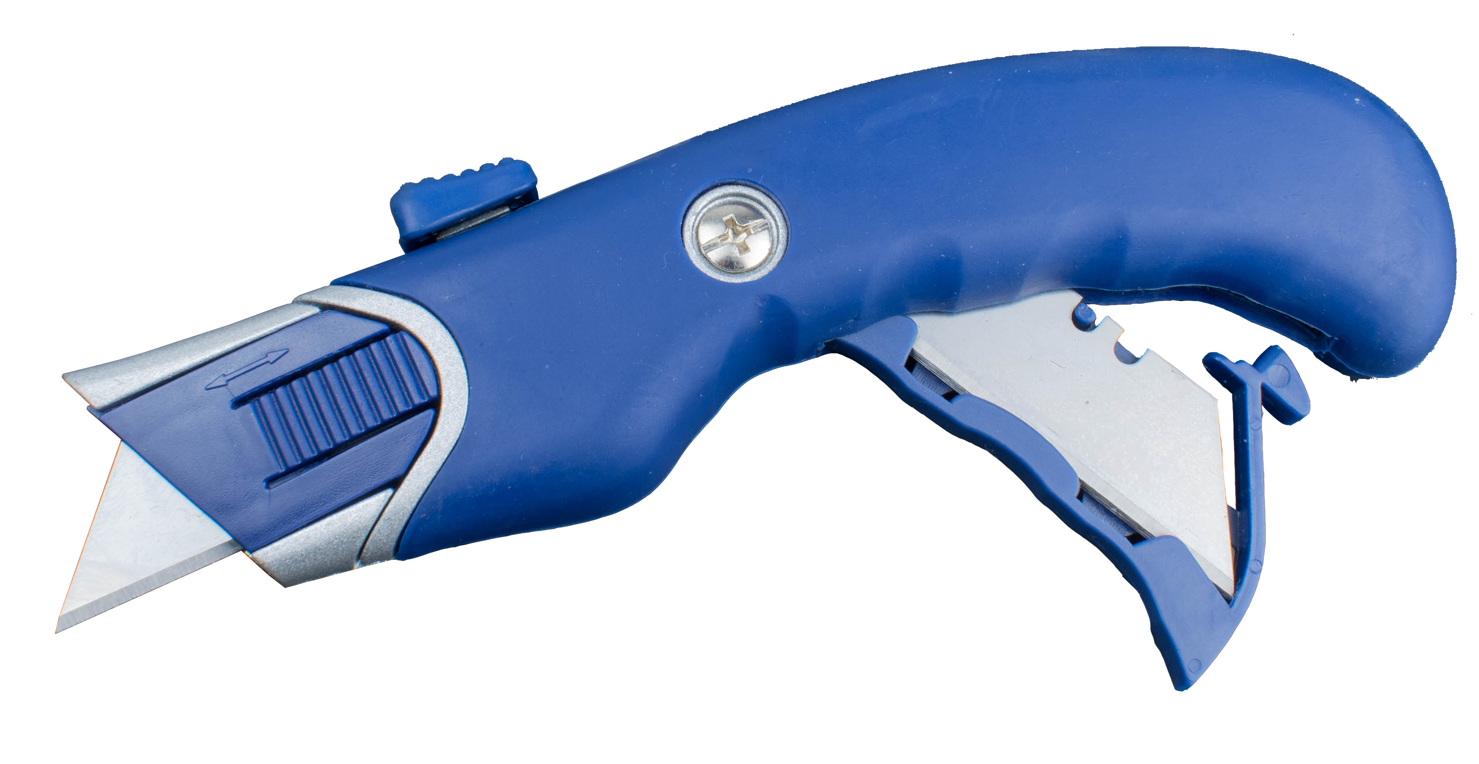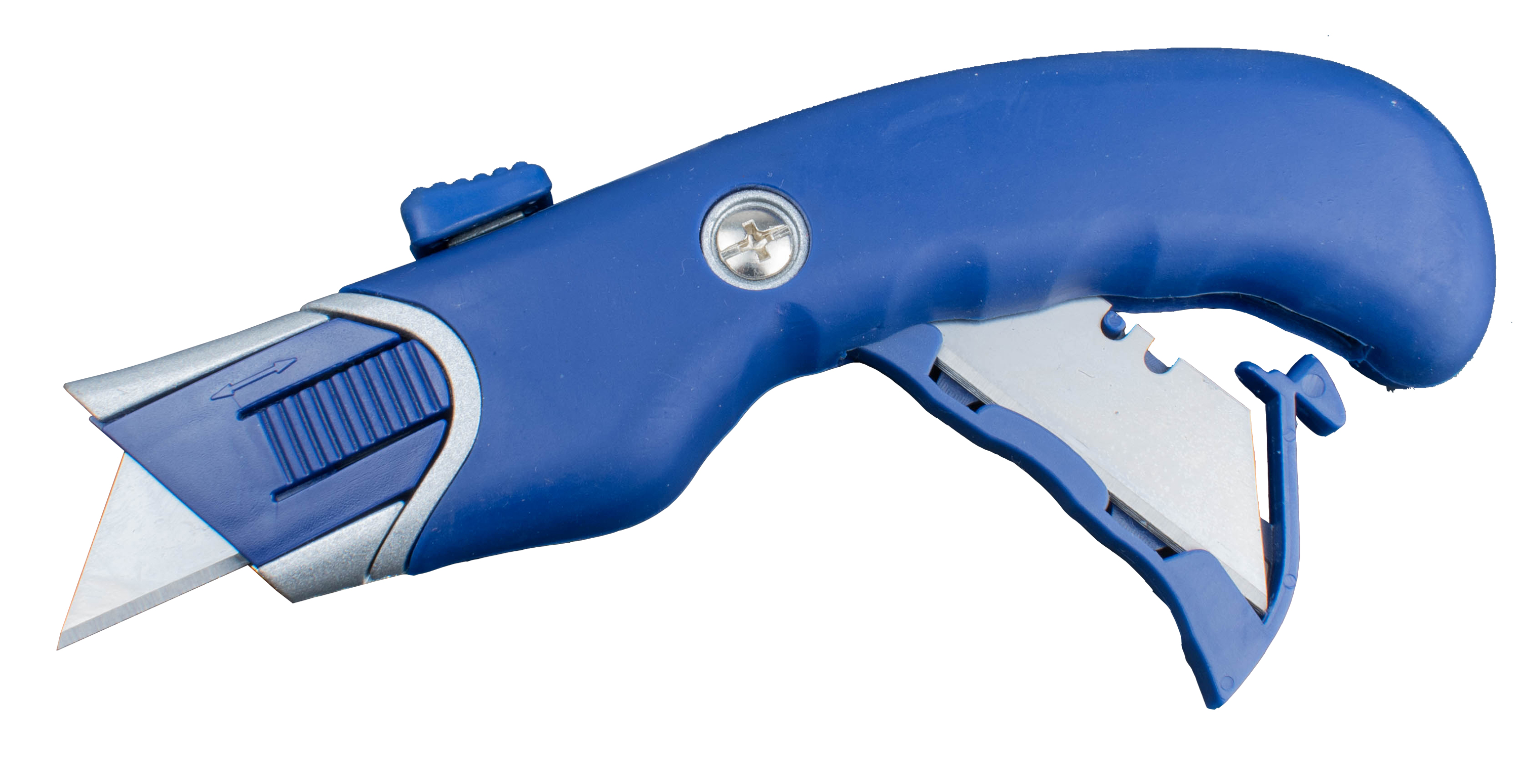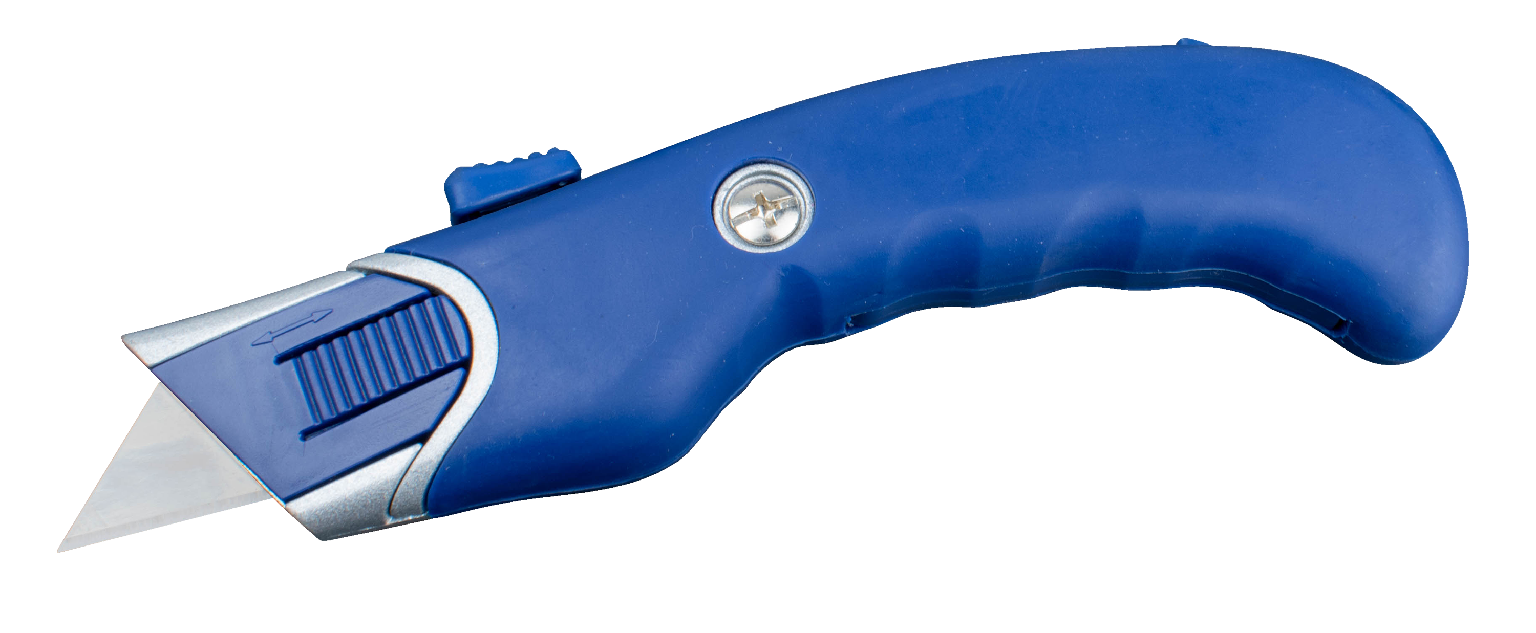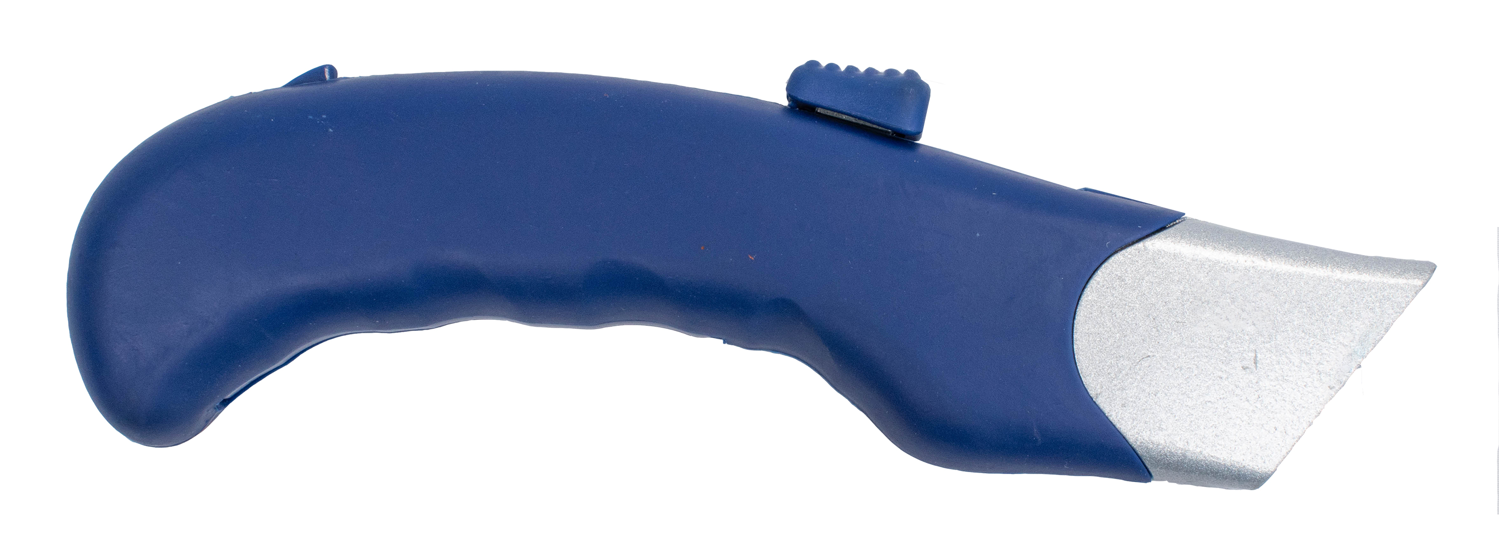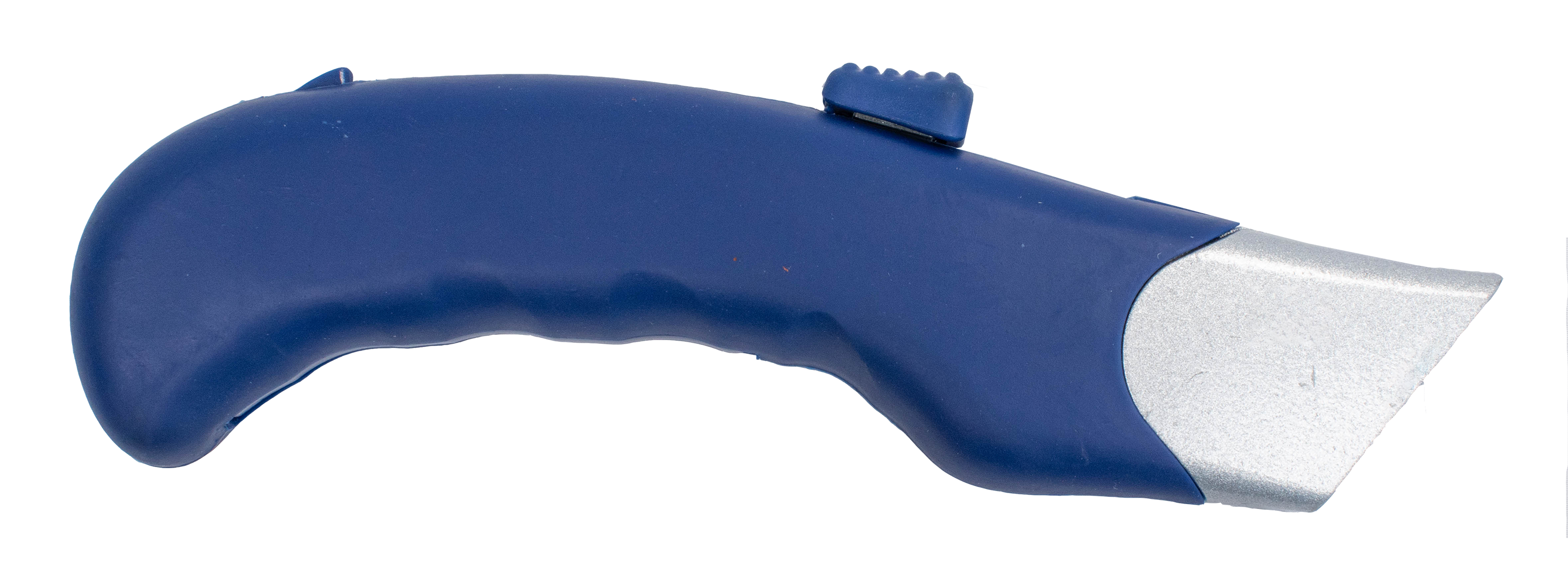 Lightweight, medium sized knife with an ergonomic rubber body beneficial for cutting cardboard boxes, polyethylene bags, and Styrofoam and more!