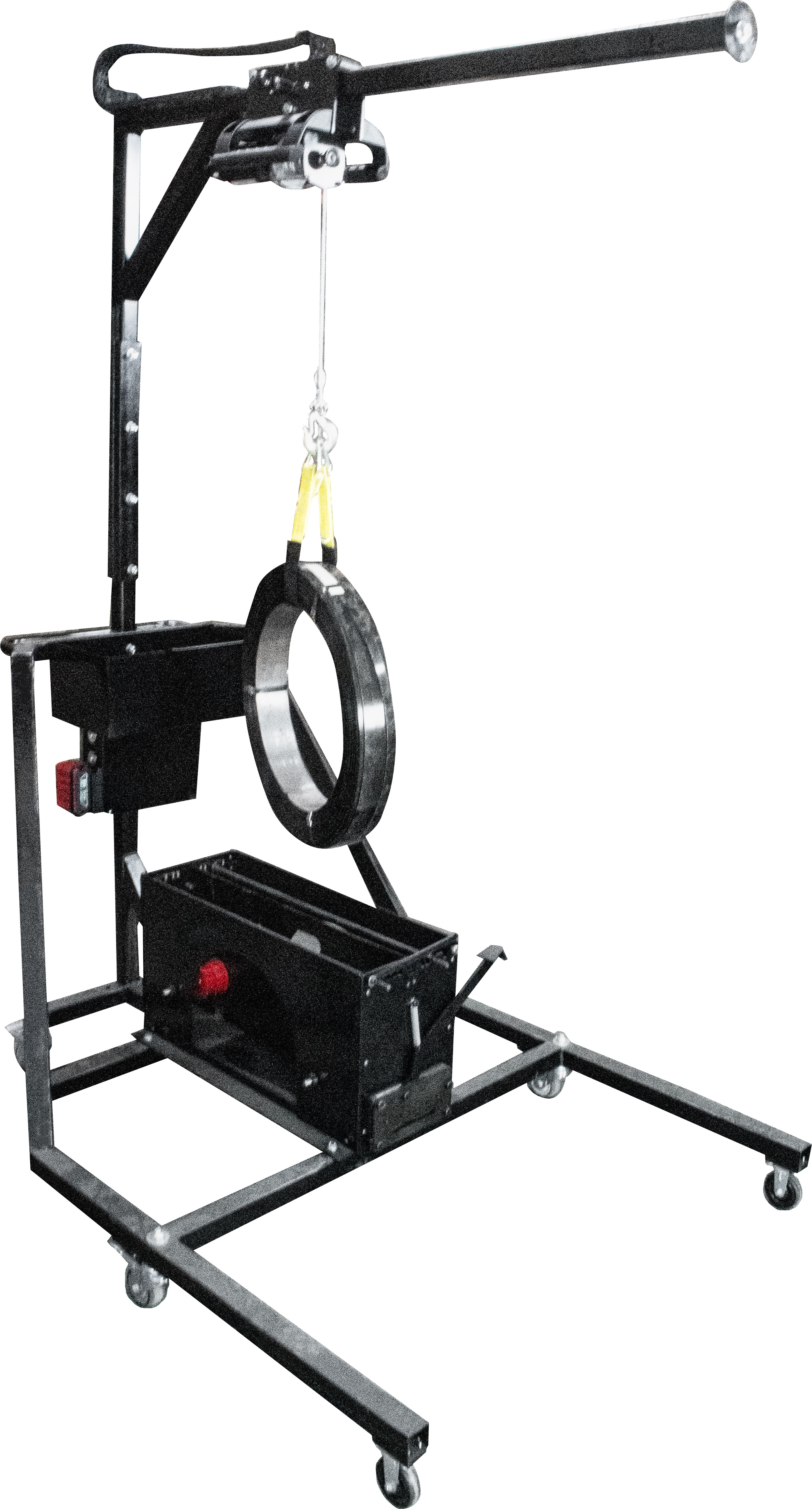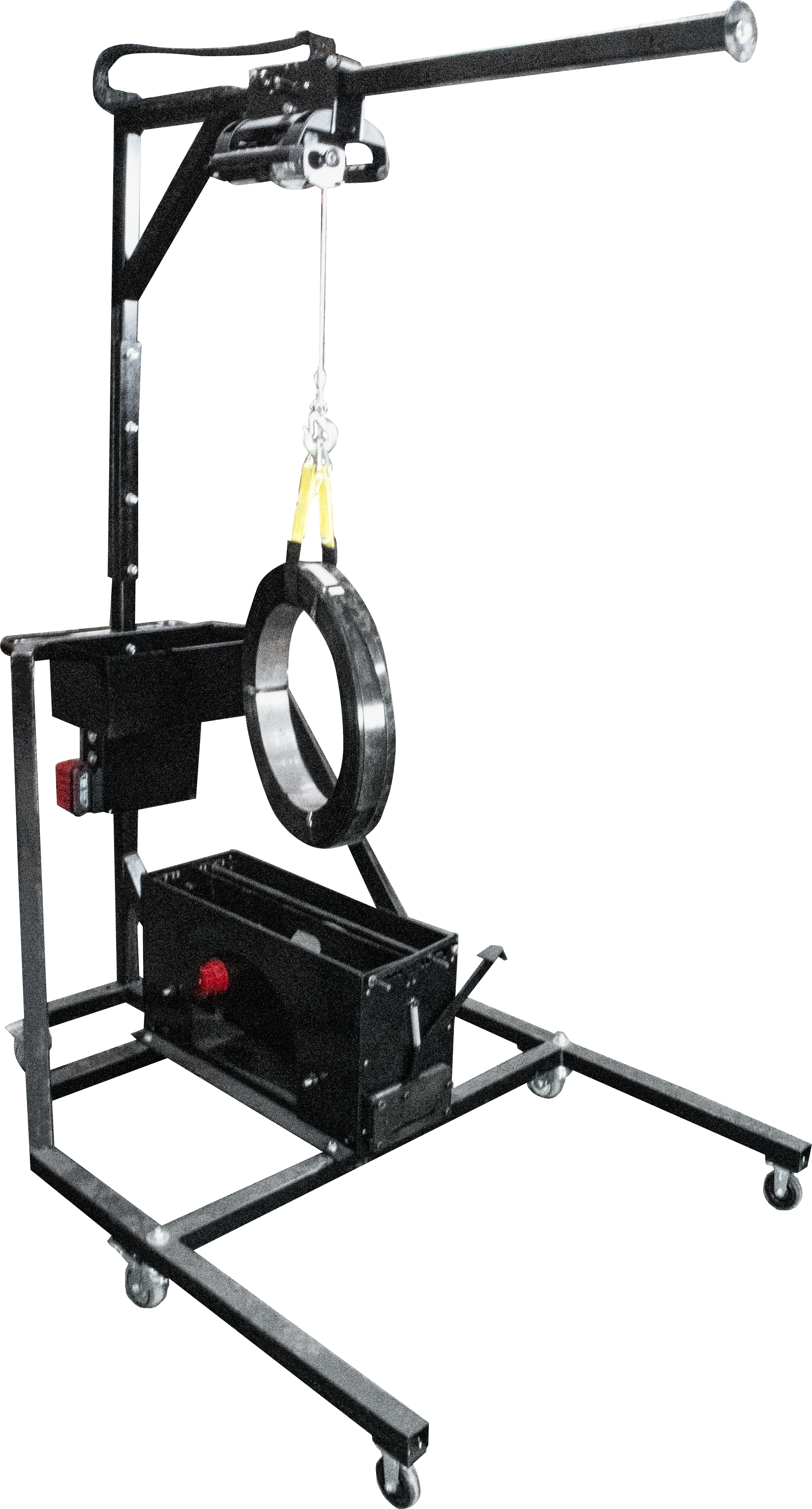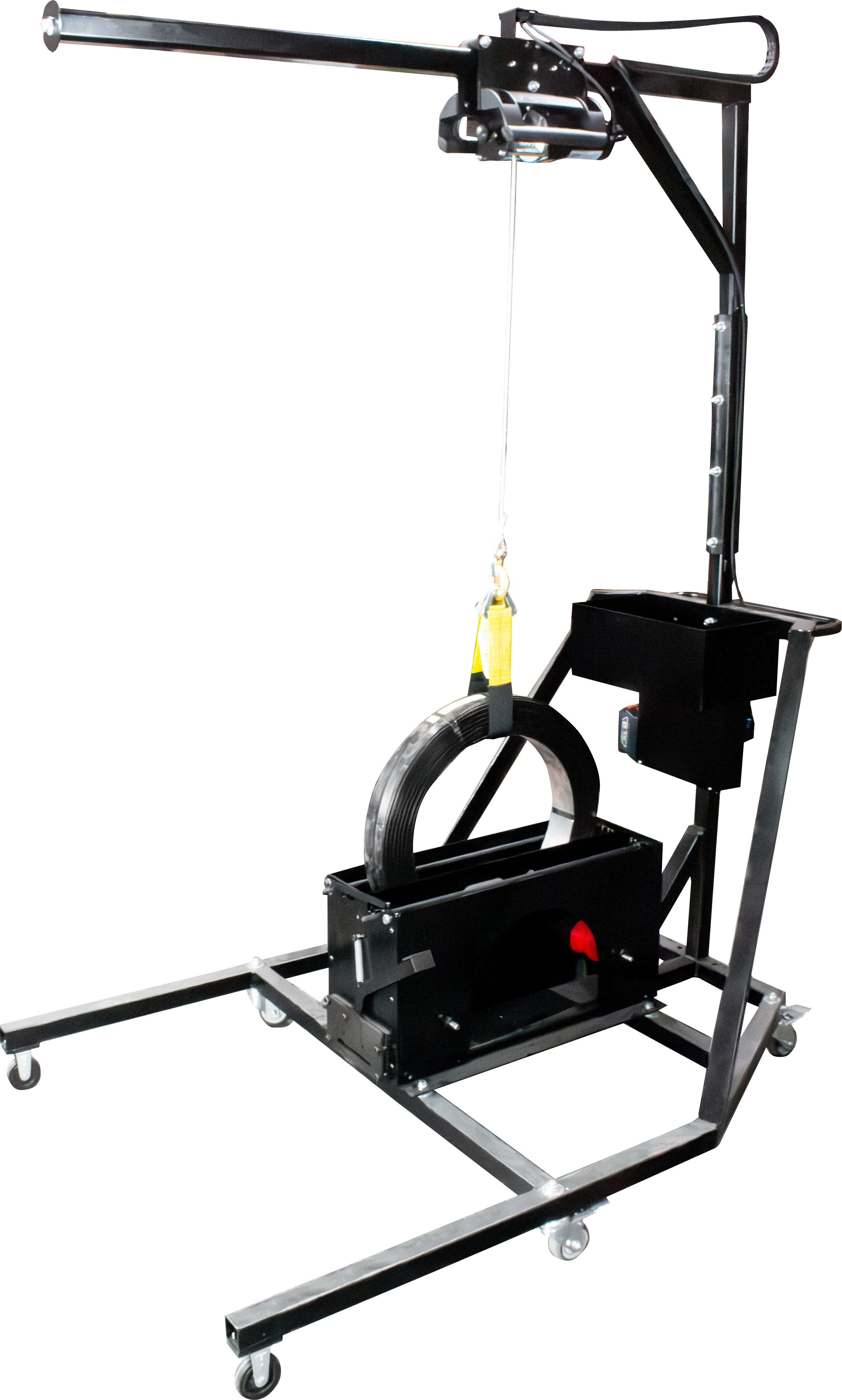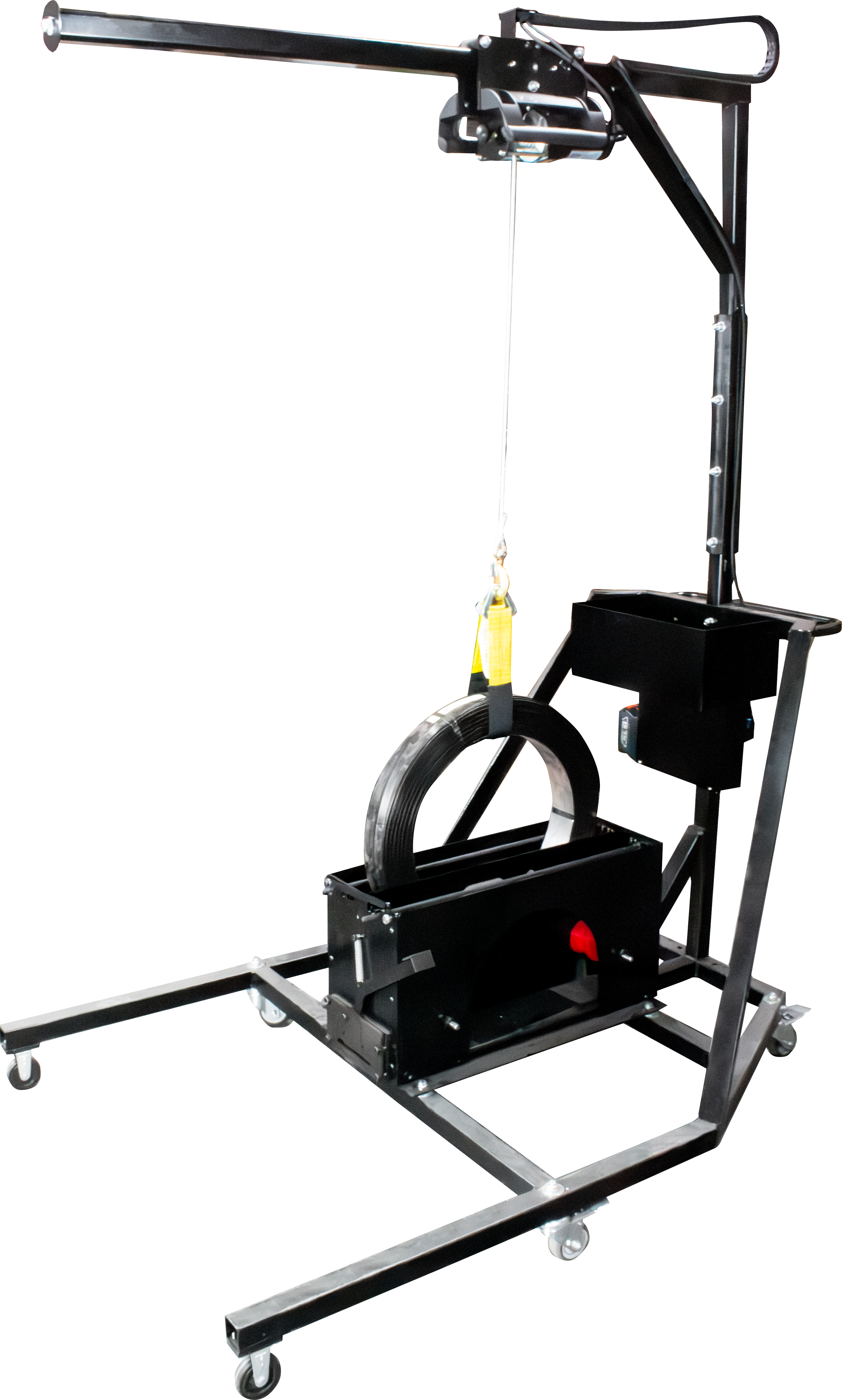 The Tool Mast includes a battery operated Lifting Device capable of loading a steel coil on the disk. The Tool Mast can also accommodate a Tool Balancer, keeping the tool and worker protected, while the tool balancer and hanger give full range of motion for proper use. Easily maneuver a comprehensive strapping station around your warehouse!